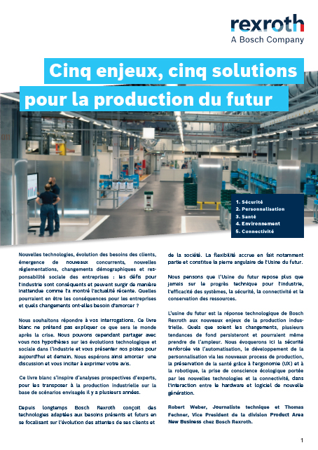 Ils mettent en lumière 5 enjeux cruciaux auxquels l’usine du futur telle que Bosch Rexroth l’imagine apporte des réponses concrètes, et font le point sur les solutions déjà disponibles ainsi que sur celles à venir.