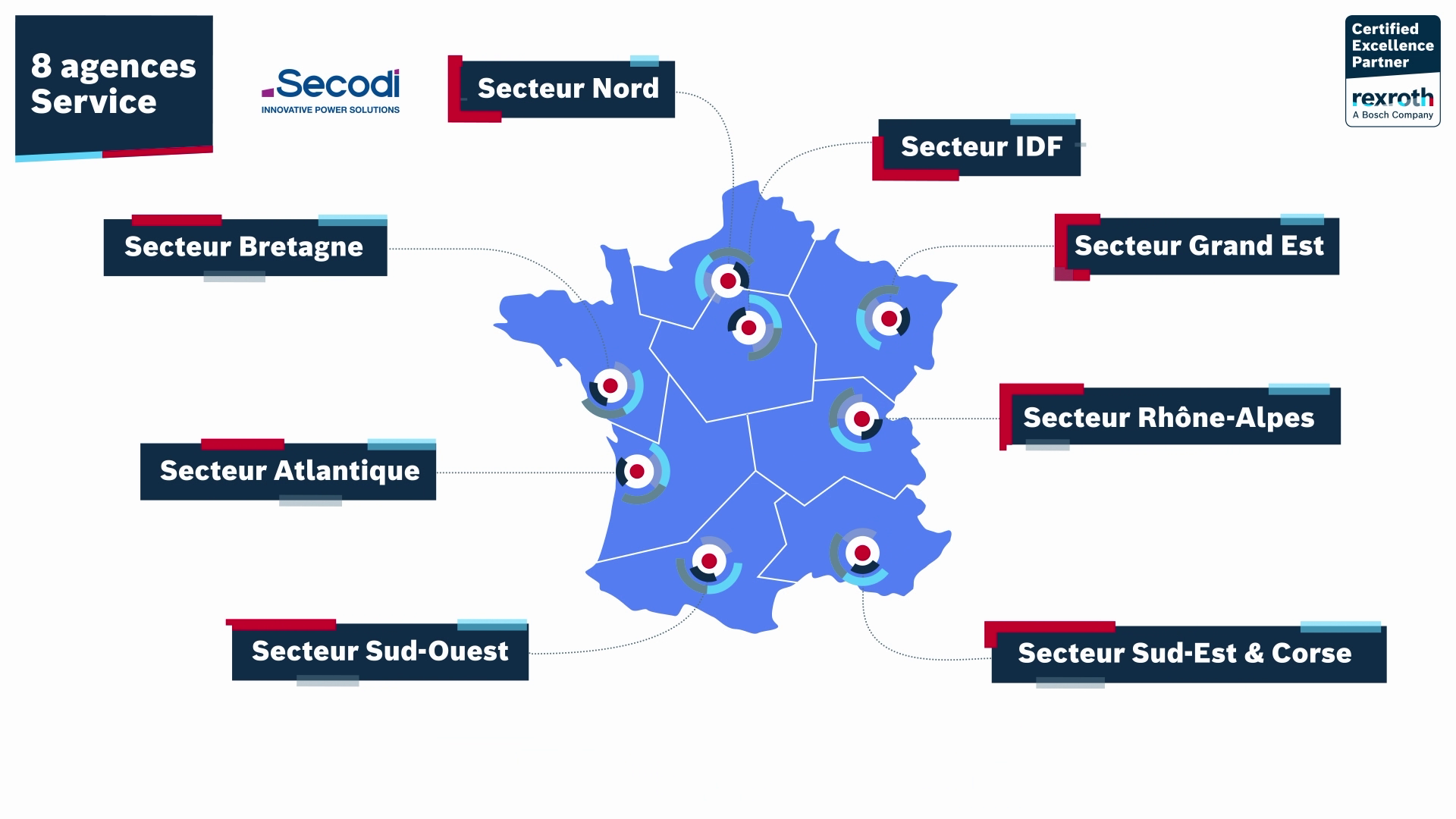 Moins de 300 kilomètres séparent SECODI de chacun de ses clients, grâce aux équipes Service Après-Vente réparties sur 8 agences, et couvrant l’ensemble du territoire national. Et pour encore plus de proximité, 10 commerciaux itinérants se déplacent dans toute la France pour promouvoir les gammes et solutions des partenaires, dont Bosch Rexroth.