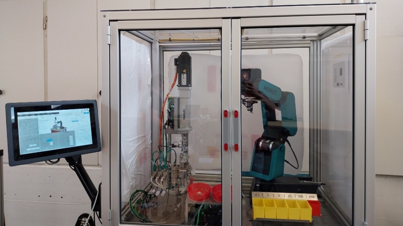 La station d’assemblage CERAFLEX est composée d’un robot six-axes de Fruitcore Robotics et de la presse électrique Smart Function Kit Pressing de Bosch Rexroth. Cette presse permet la mise en œuvre simple et rapide de différentes opérations d’assemblage mais aussi de fonctions de mesure. Le sous-système mécatronique Rexroth comprend en effet des composants préconfigurés et coordonnés de manière optimale ainsi qu’un logiciel d’exploitation préinstallé.