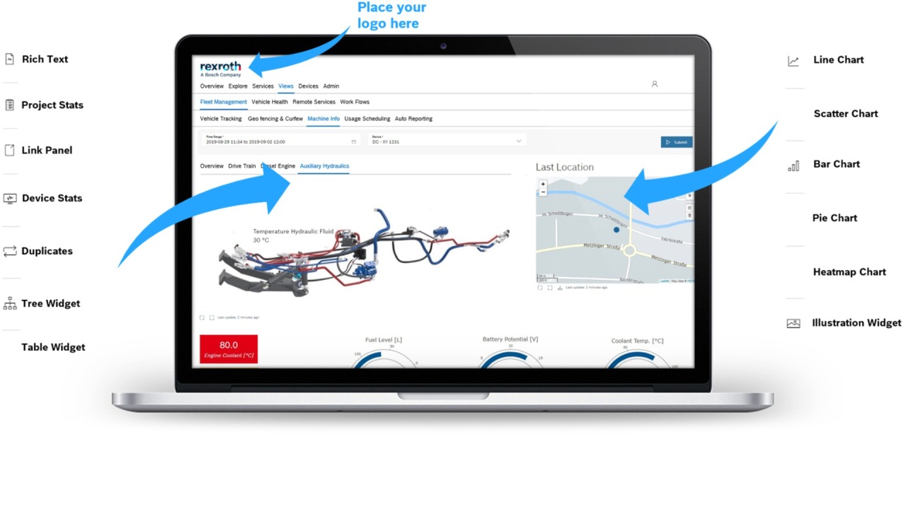 Sur la base d’applications, de tableaux de bord et de widgets spécifiques au secteur off-highway, des interfaces de pilotage propres à l’utilisateur peuvent être créées par simple glisser-déposer de modules prêts à l’emploi.