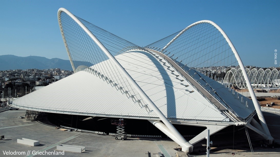 Pour le vélodrome d’Athènes, la machine de profilage mobile d’Ortic a formé les longs profilés en métal directement sur le chantier de construction. Les vis à rouleaux satellites PLSA qui ont une durée de vie importante sont un élément essentiel de la machine. (Copyright : Ortic)